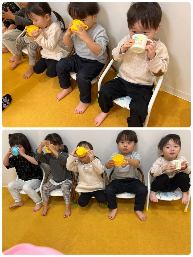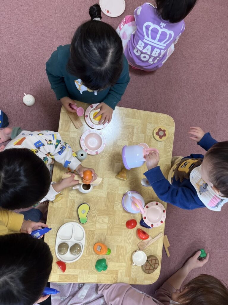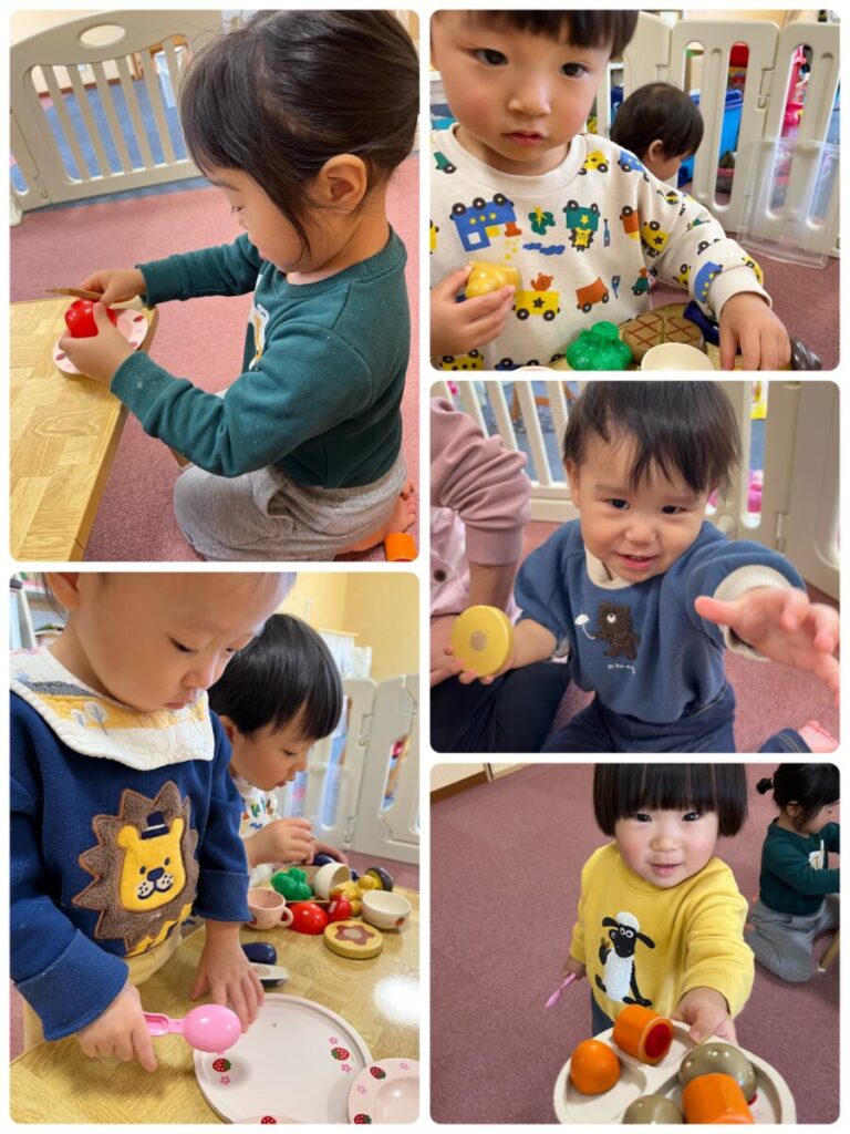 高蔵寺園 2025年11月20日 今日も元気に 今日は二手に分かれて お散歩チームと おままごとチーム😊 おままごとチームは こんな感じ🔪🍆 お散歩から帰ってきた いちごぐみ 水分補給して 遊びました😄 お給食を食べて おやすみなさい💤