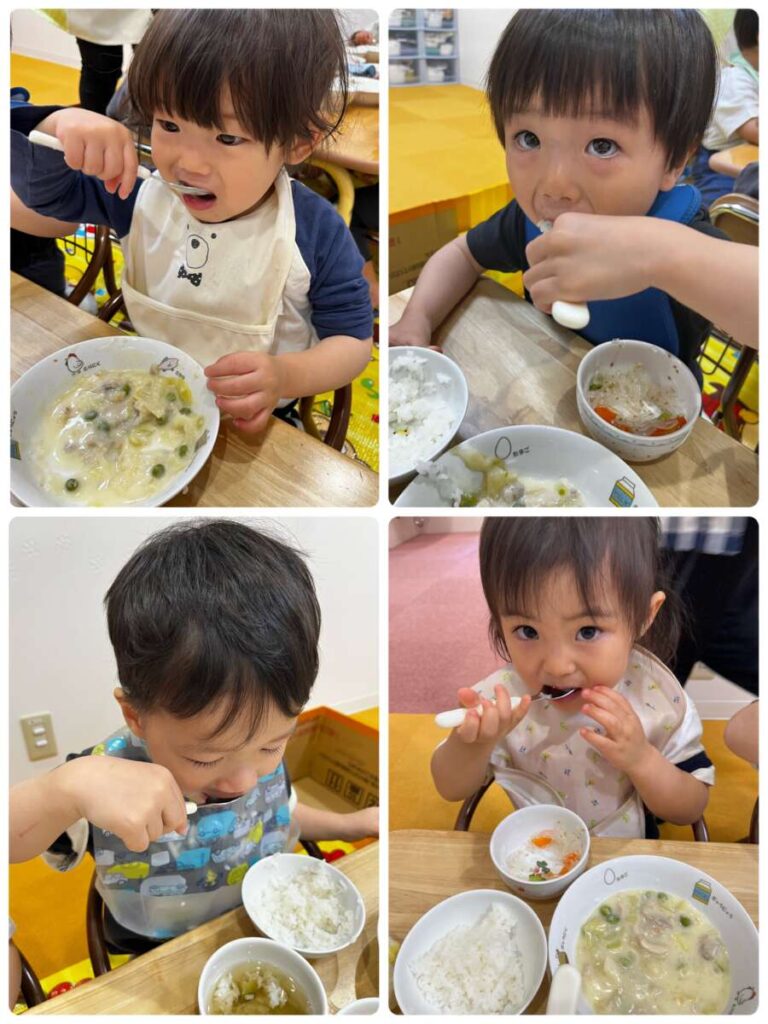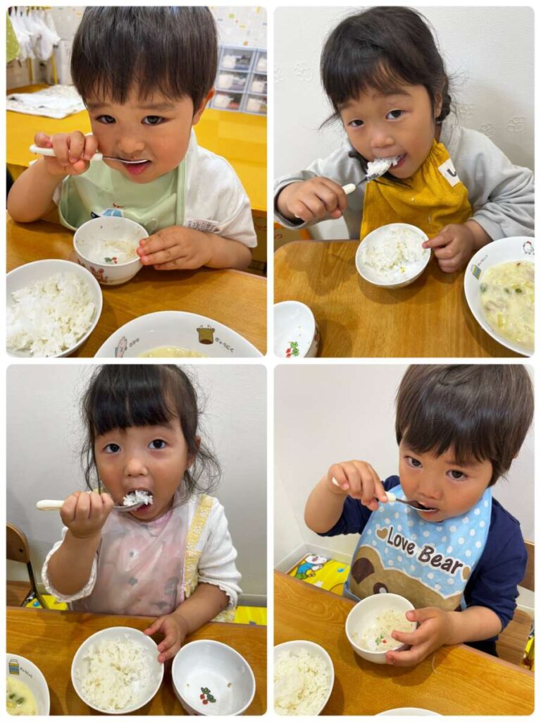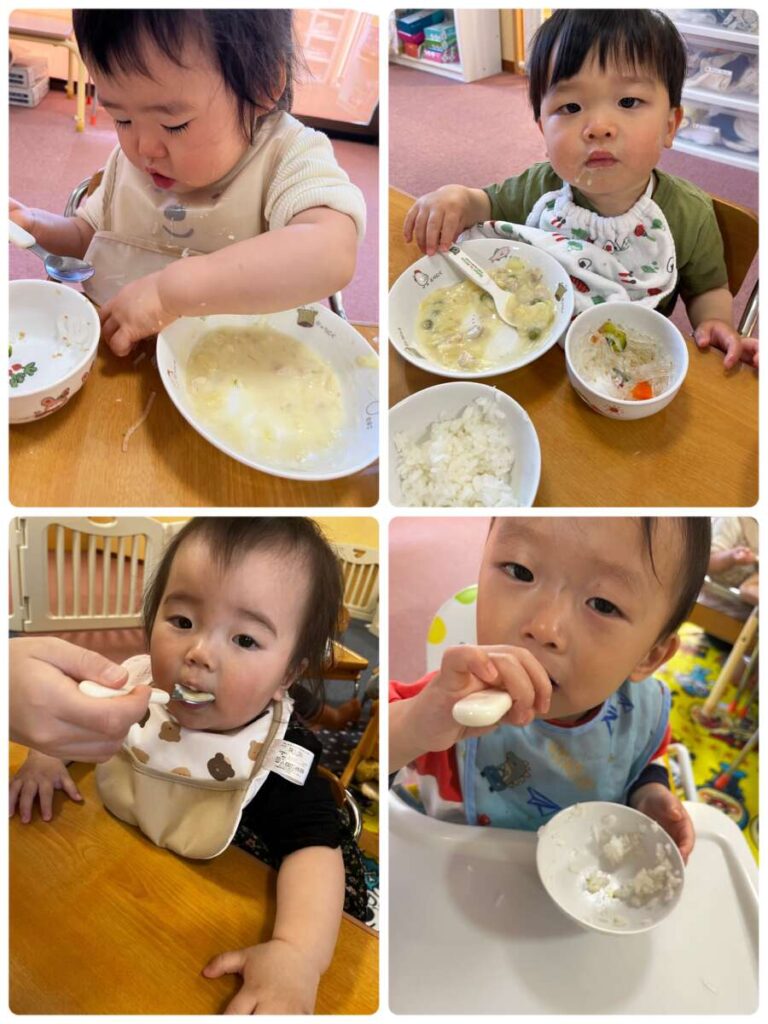 高蔵寺園 2026年04月16日 美味しいね😋 今日の給食は、 鶏肉と野菜の豆乳クリーム煮 春雨ごまサラダ・スープです😊 みんな美味しそうに食べています😋 お散歩に行って、給食を食べて 今からお昼寝です💤