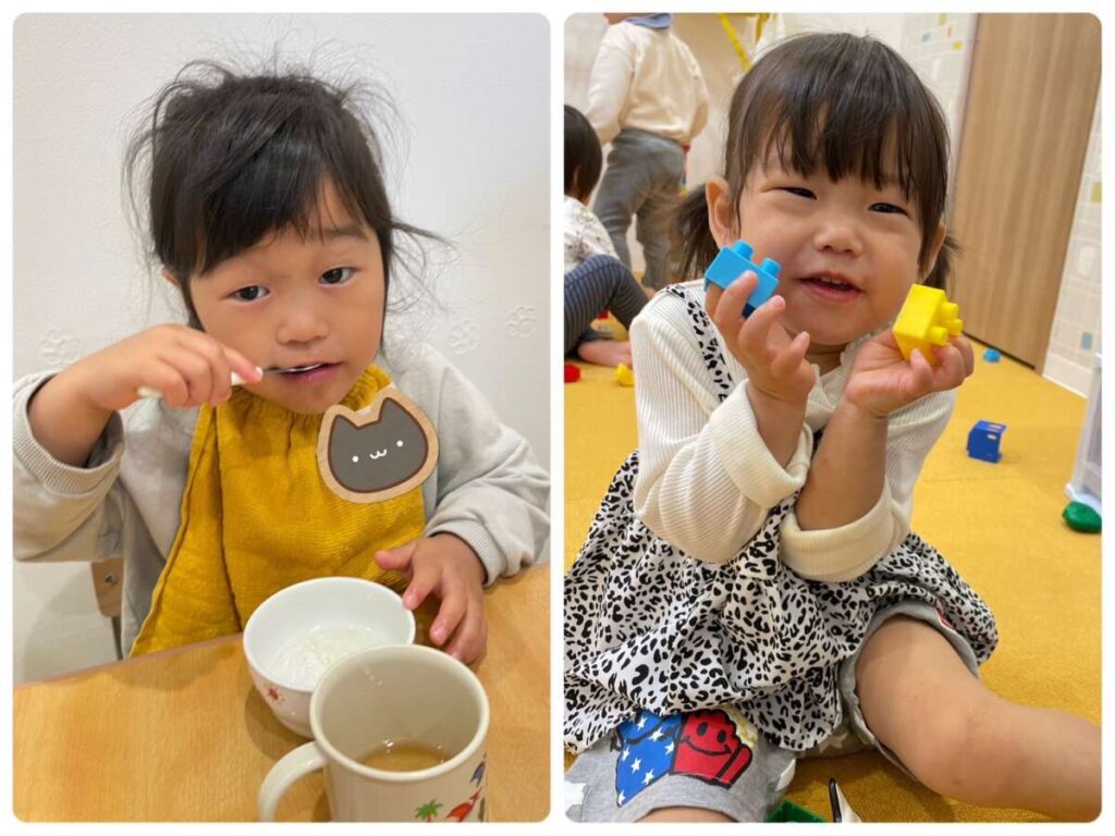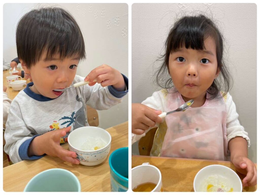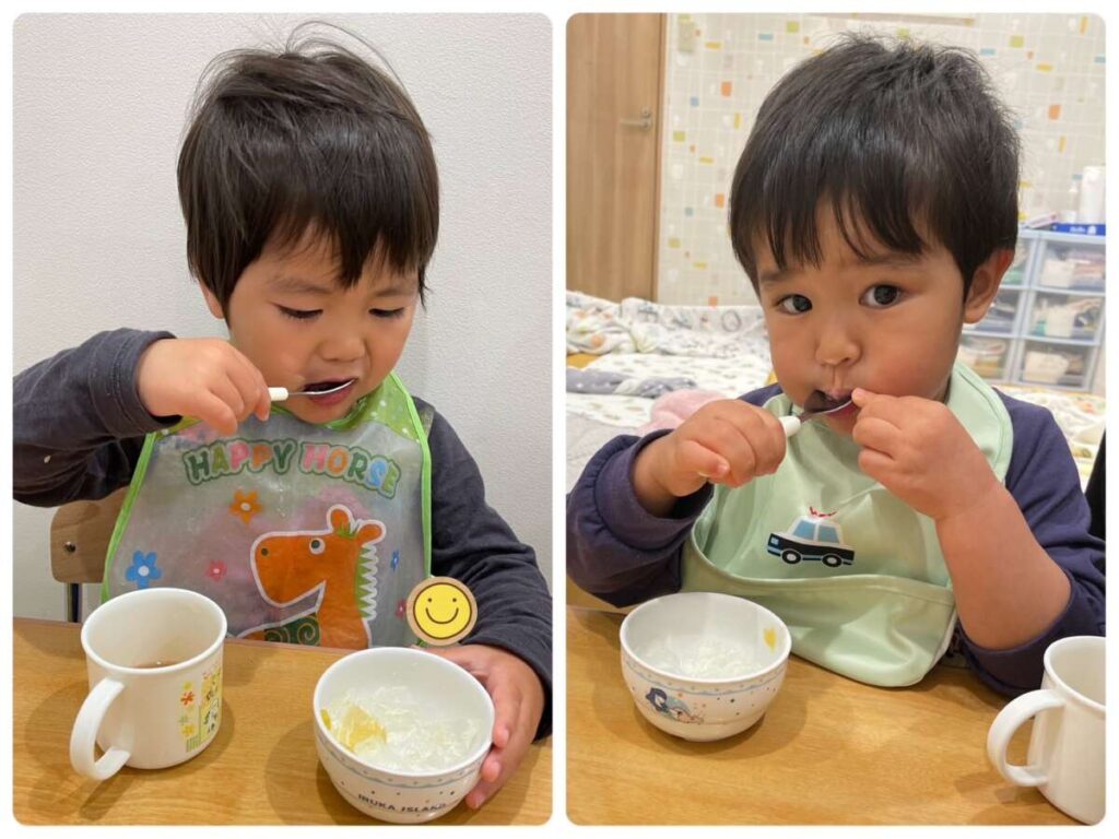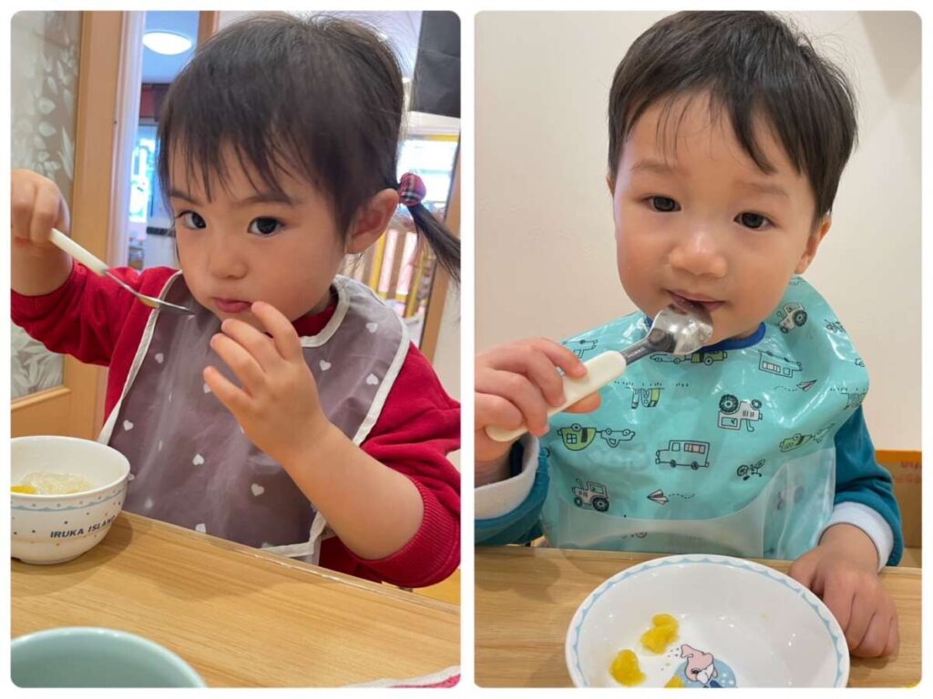 高蔵寺園 2026年04月21日 今日も元気です😄 今朝雨が降ってしまい 公園はぬれているので 線路沿いをみんなで散歩しました🚃 ももぐみさん、 よく寝ています😪💤 今日のおやつは黄桃ゼリー🍑 いちごぐみさん 自分で上手に食べています😋