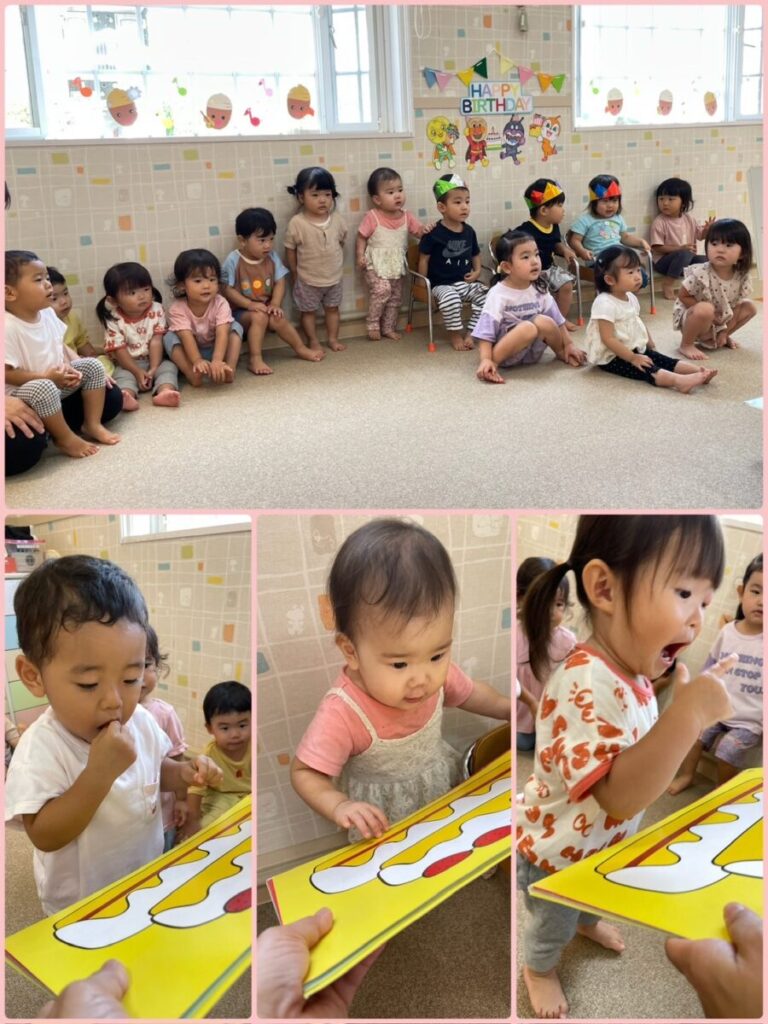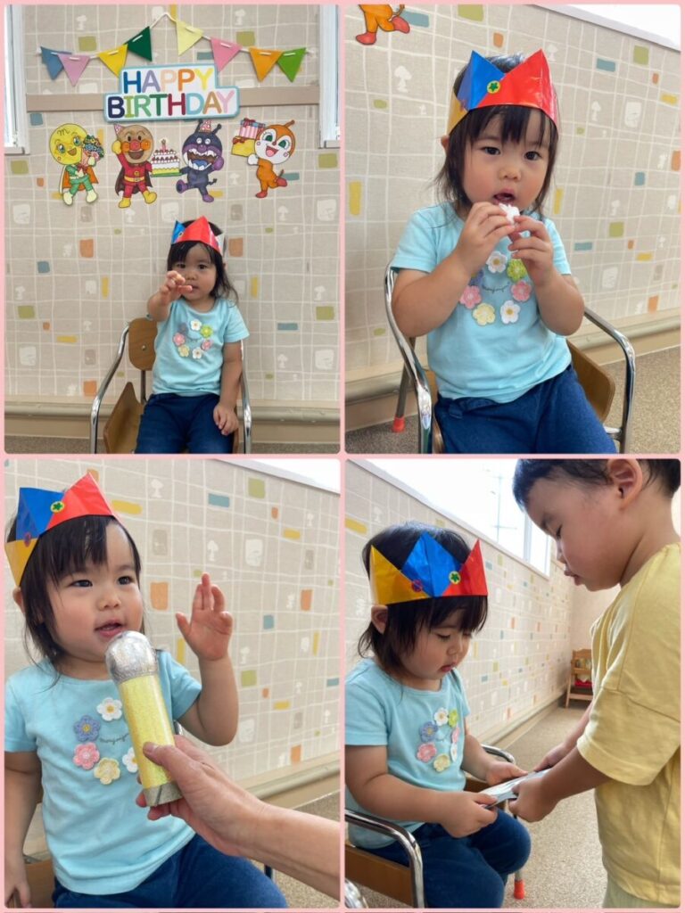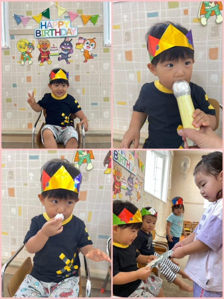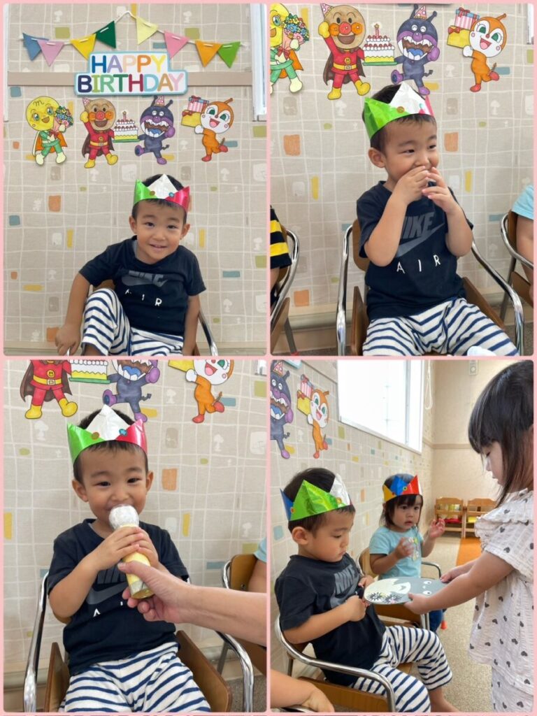 出川園 2025年09月26日 9月のお誕生会①🥳 今日は9月生まれのお友達の お誕生会をしました🎉 みんなニコニコ 嬉しそうでした😊 たくさんご飯を食べて たくさん遊んで 元気に大きくなってね😄 お誕生日おめでとう🎂 ※今日お休みしたお友達は また後日お誕生会をしますね。