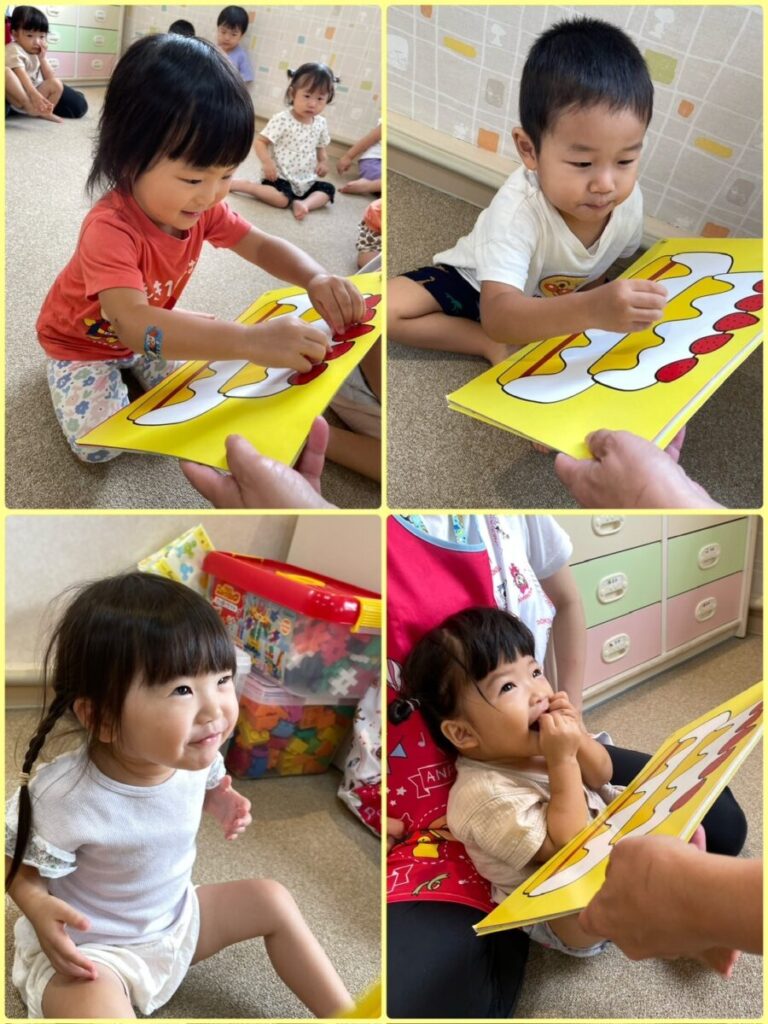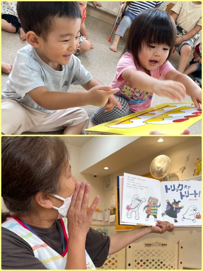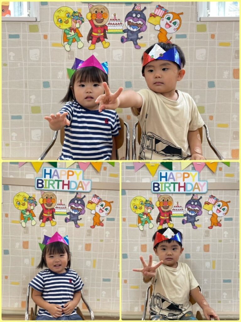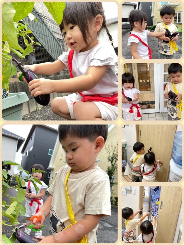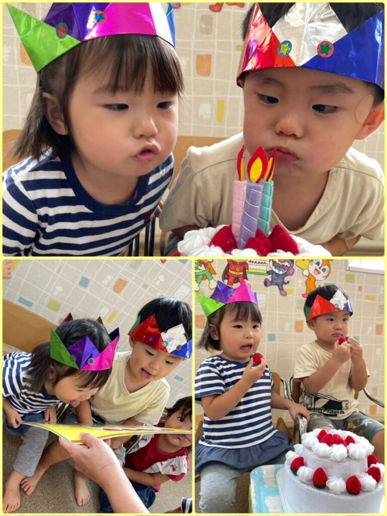 出川園 2025年09月29日 9月のお誕生会②🥳 今日は9月のお誕生会第二弾! 先日お休みだったお友達の お誕生会をしました🎂 たくさん遊んで、たくさんご飯を食べて 元気に大きくなってね😄 お誕生日おめでとう🎉 みんなにもお誕生ケーキの おすそ分けです🎂🍓 ↑来月はハロウィーン👻 トリックオアトリート! 上手に言えるかな??? 今日のお当番さんはこのふたり😊 終わりも近づいてきたナスを はさみでちょきんと収穫です🍆