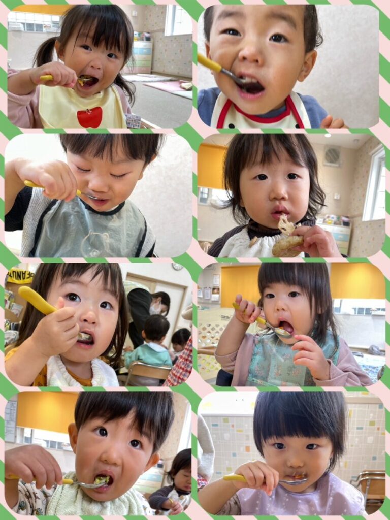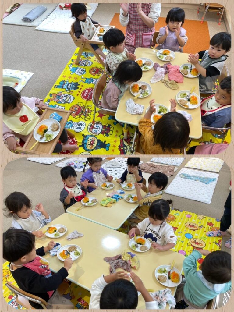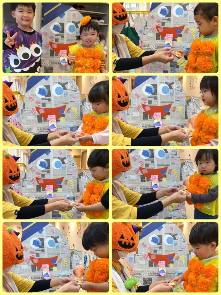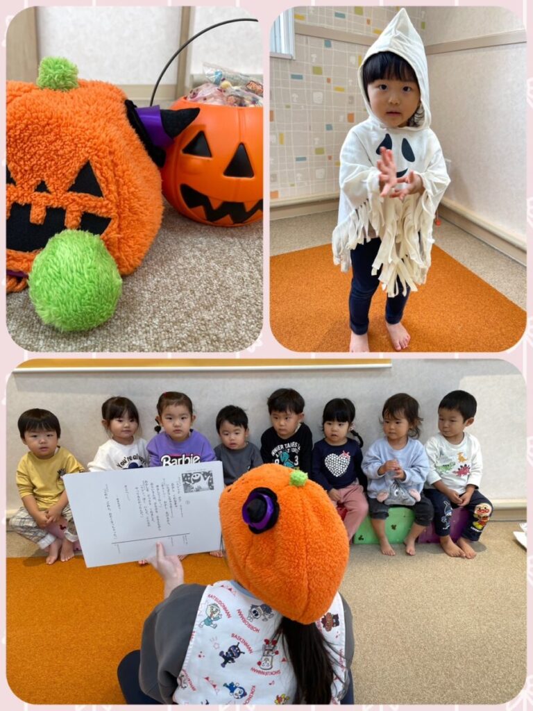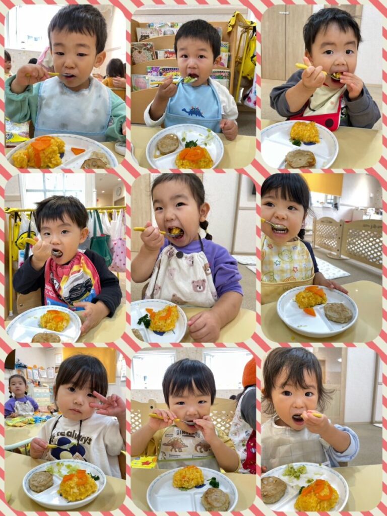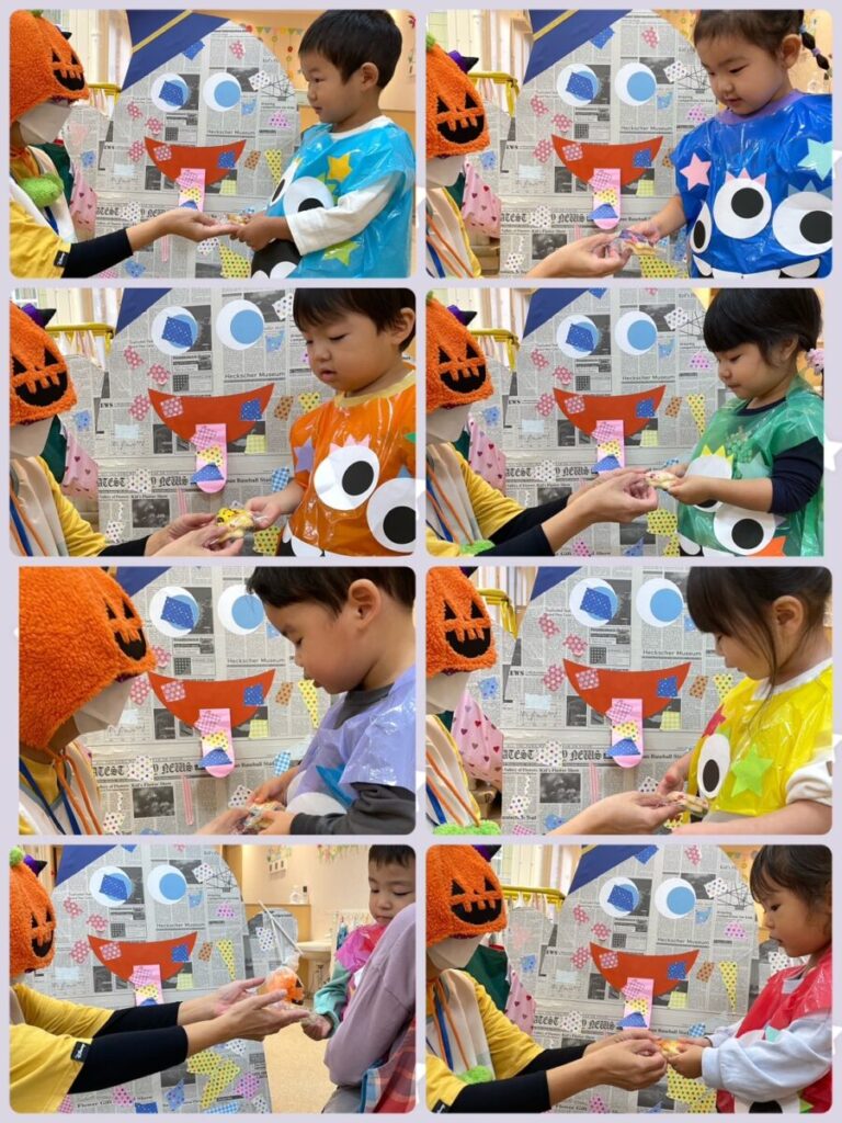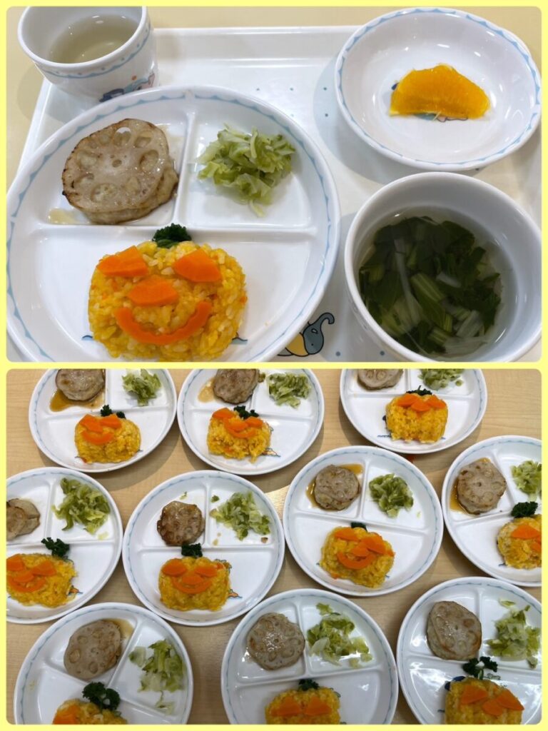 出川園 2025年10月31日 🎃ハロウィン🎃 今日はハロウィン🎃 給食は、かわいいかぼちゃが たくさん並んでいます😁 みんな大きなお口で食べています😀 かわいいおばけ👻 「トリックオアトリート!」 今日のおやつは、ハロウィンの おせんべいです🍘