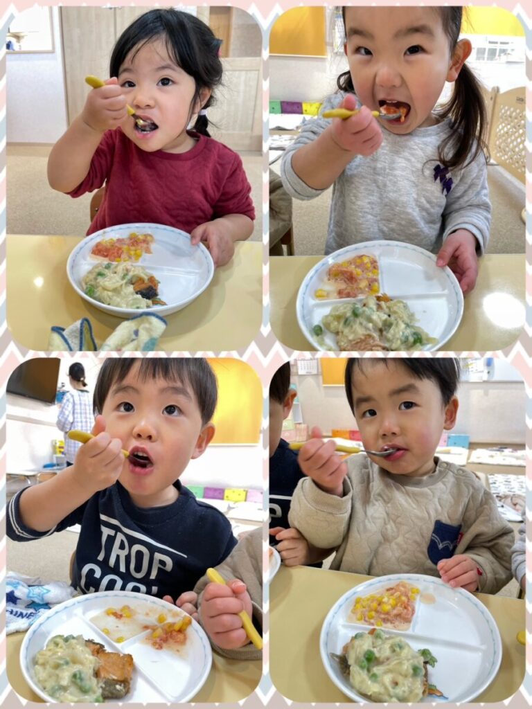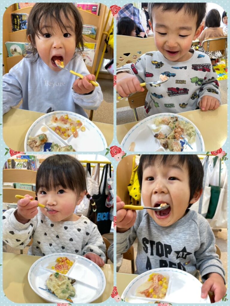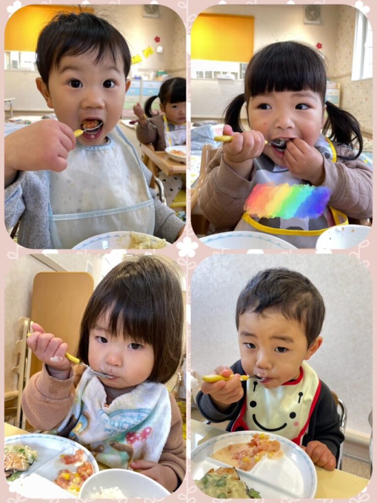 出川園 2026年01月22日 給食😋 🎵きゅうしょくきゅうしょく うれしいな🎵 何と大きなお口でしょう(笑) 毎日子ども達は、 給食のおばちゃんが作ってくれる 美味しい美味しい給食を た~くさん食べています😋