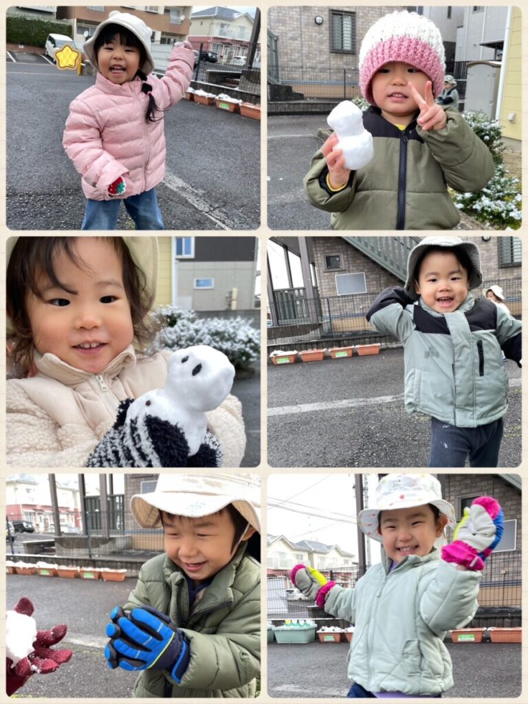 出川園 2026年01月26日 ゆ〜きやこんこ⛄️ 先週の金曜日は、たくさん雪が降って いちごぐみさんはお家から 手袋持参で登園🧤 雪だるまを作ったり 雪投げをしたり 元気に遊んでいました😄 みんなで「せーの!」で 雪玉を投げました(笑) ももぐみさんも ちょっぴり雪のおすそ分け⛄