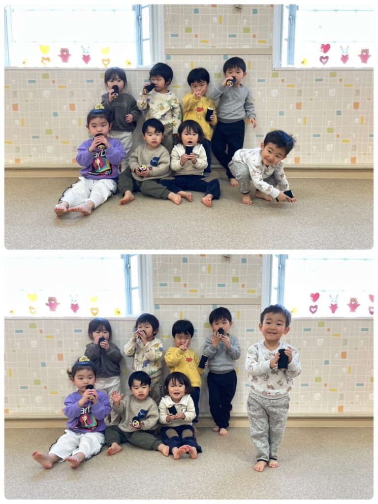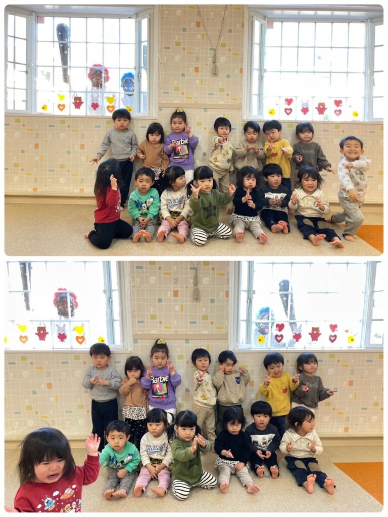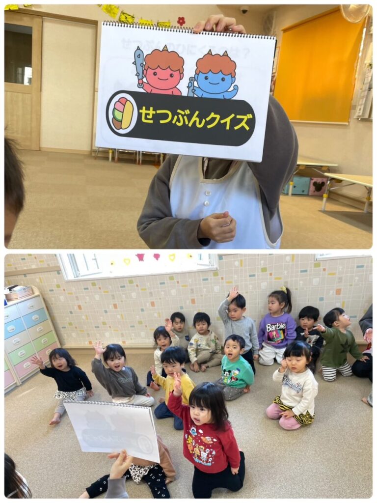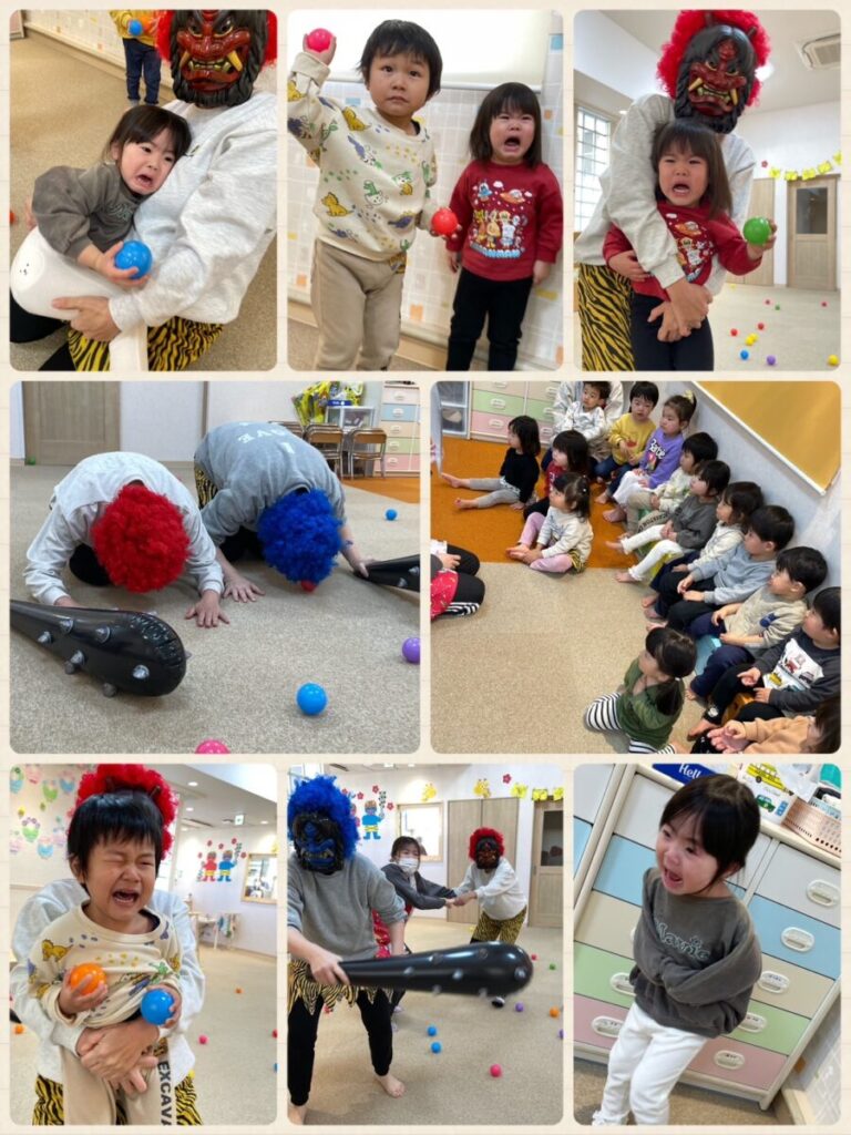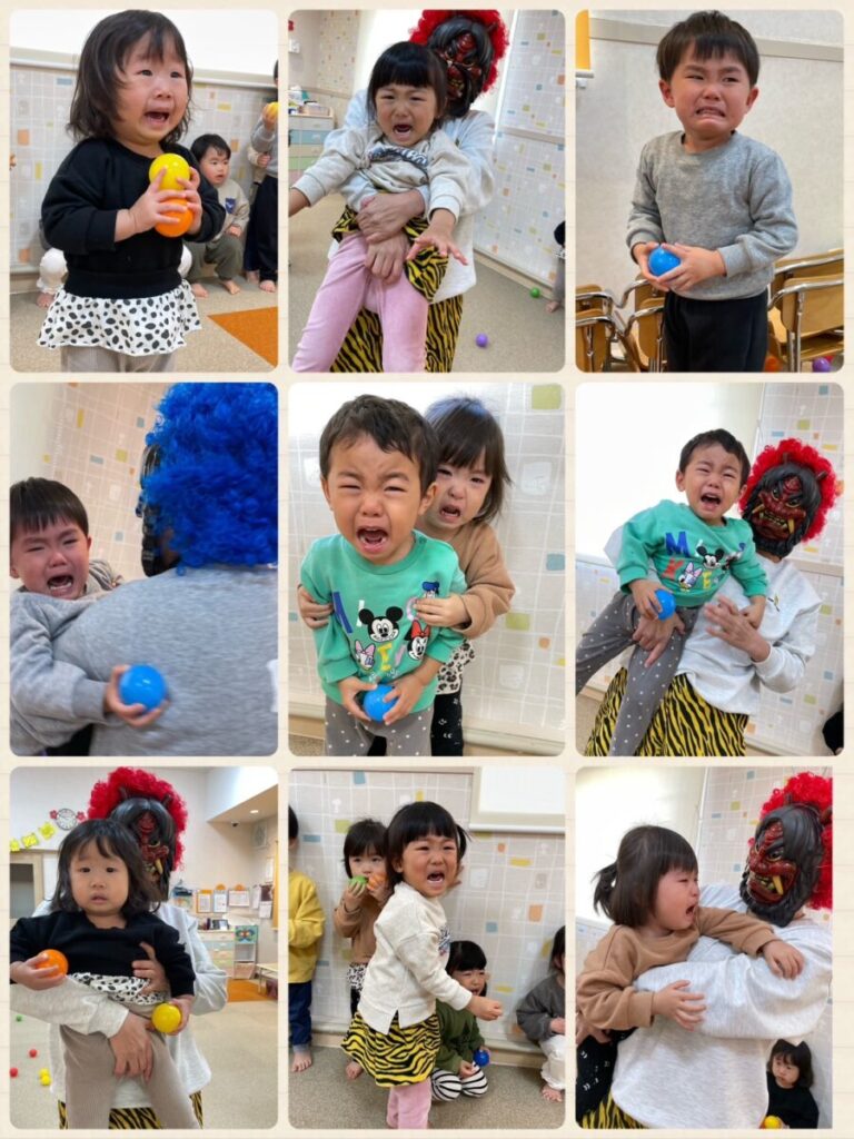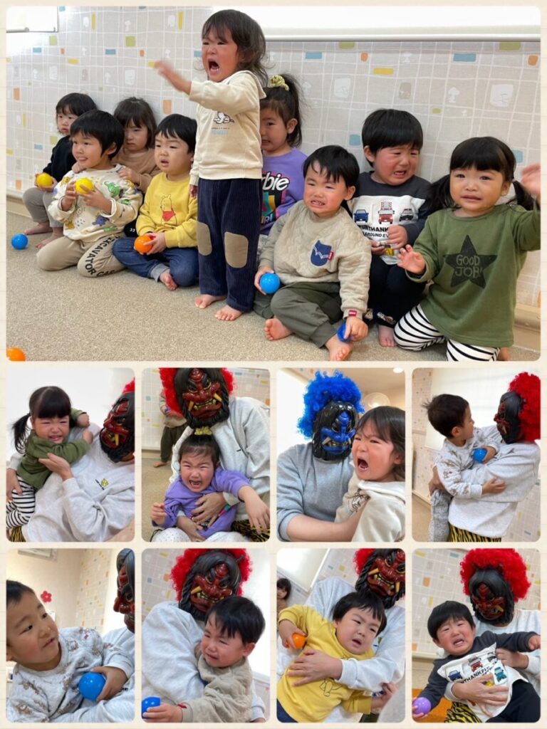 出川園 2026年02月04日 鬼は外福は内👹 昨日は節分でした👹 先生のクイズやお話を聞いていると・・・ 窓の外に・・・👹 誰か気がついていますね・・・😢 あれあれ、鬼が保育園の中に 入ってきてしまいました👹 子ども達は大泣きです😭 ボールで鬼を退治する練習も していたのにそれどころではありません(笑) たくさん泣いたところで 鬼もみんなの頑張りに??降参して 帰っていきました👹👋 給食は【鬼さんライス】 可愛い鬼に子ども達も 大喜びでした😋